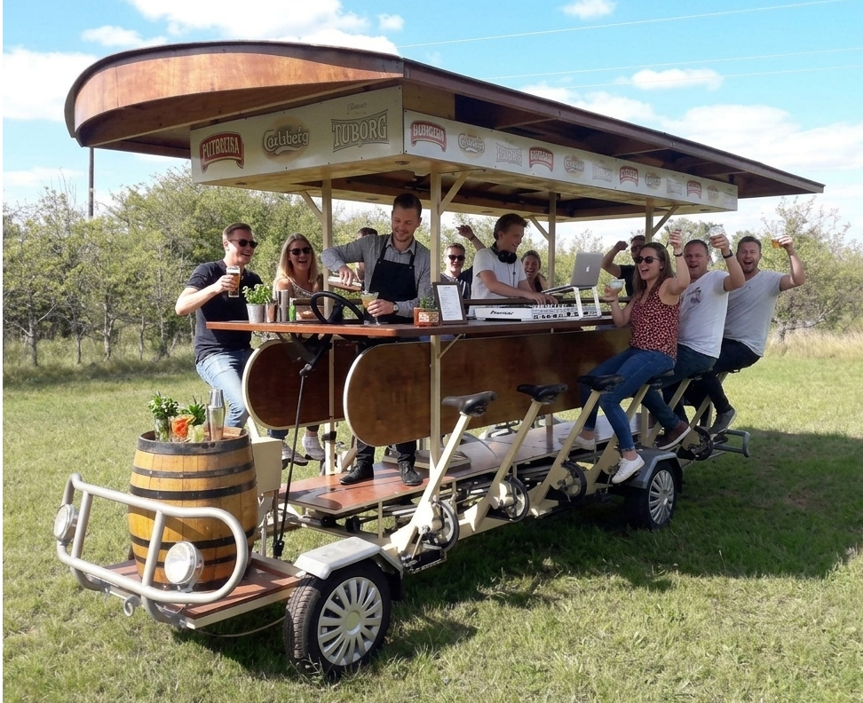 1. BarCykeln: Fest på hjul BarCykeln är idealisk för grupper på 8–18 personer på en och samma vagn. BarCykeln är en bar med pedaler – det handlar om upplevelsen i lugnt tempo.